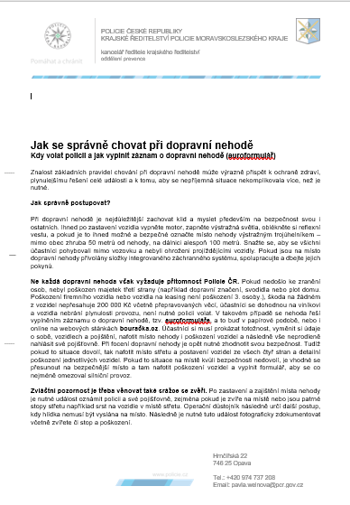 Jak se správně chovat při dopravní nehodě Kdy volat policii a jak vyplnit záznam o dopravní nehodě (euroformulář)......